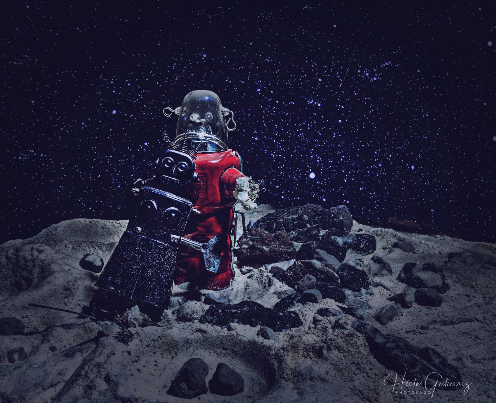 En Insomniografías, nos sumergimos en un viaje donde el autor nos muestra los logros obtenidos a través de creaciones exclusivas de escenarios insólitos y personajes de alto impacto visual. La primera vez que estuve ante la imagen de una de las maquetas realizadas por Héctor, nunca llegué a vislumbrar que, tras ella, se encontraba este descomunal trabajo, al cual se entrega en su taller como si se tratara de una larga meditación. Pareciera que, en este recinto, este fotófago fuera lanzado de este mundo para entrar en otra dimensión donde es visitado por las musas y con el regalo de su inspiración, aunado a su disciplina y entrega, logra resultados extraordinarios que llenan de satisfacción al público más exigente.